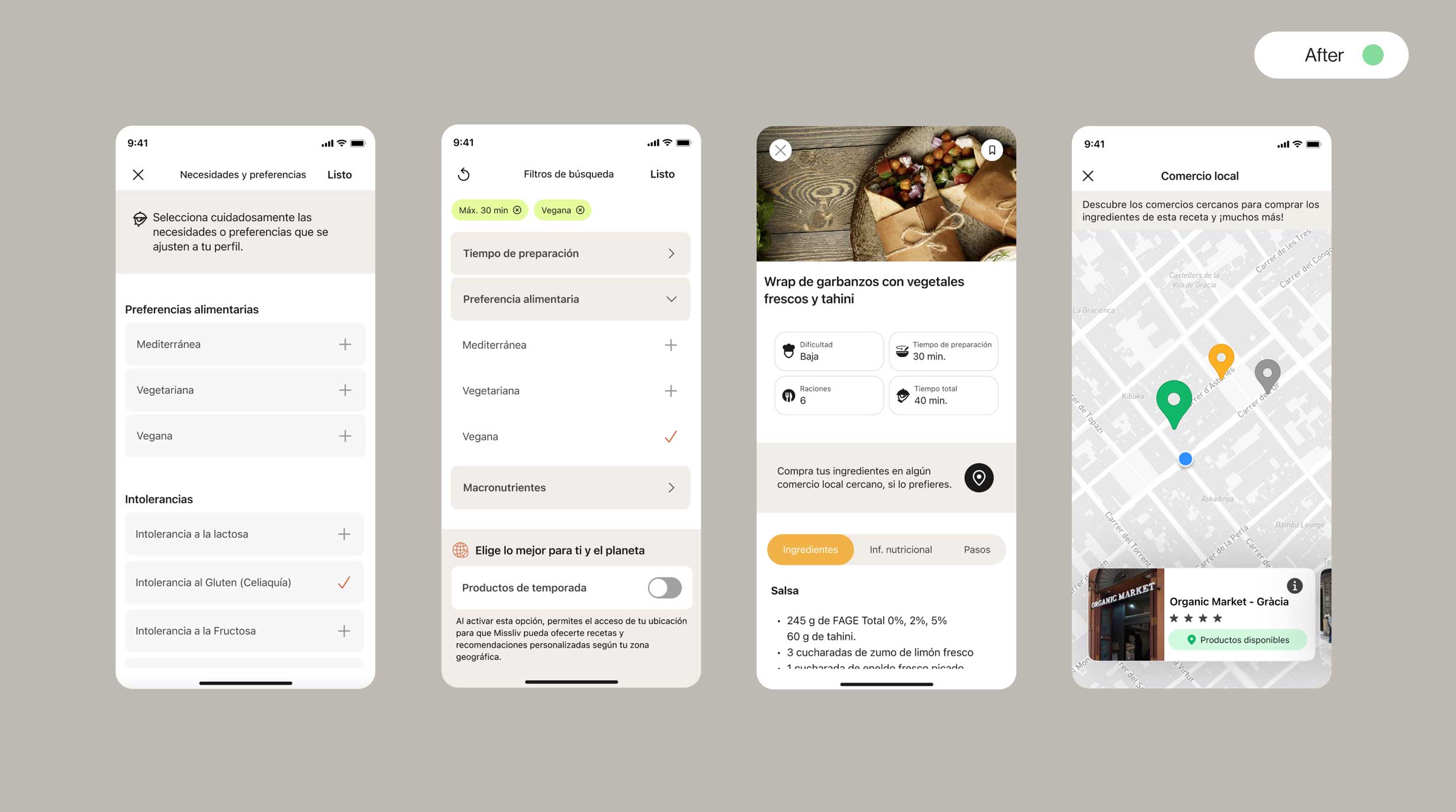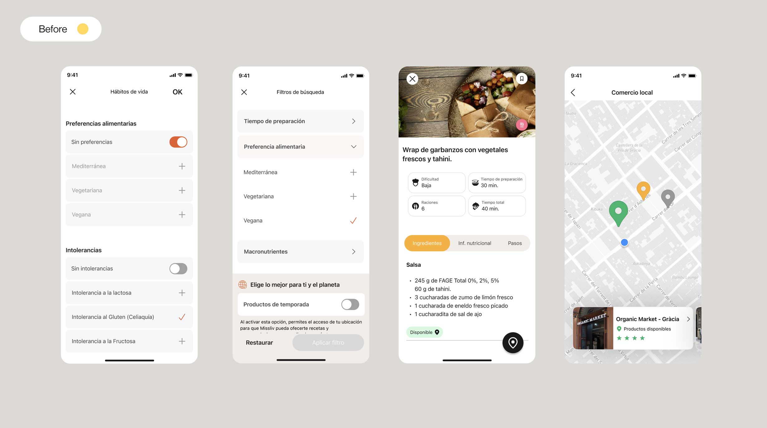 Based on the hypothesis that if people interested in healthy and sustainable nutrition gain access to a digital experience that educates, diversifies, and personalizes, adoption will increase and long-term engagement will follow. This idea is brought to life through a set of concrete features designed to support users in daily decision-making and address the challenges of their personal context.